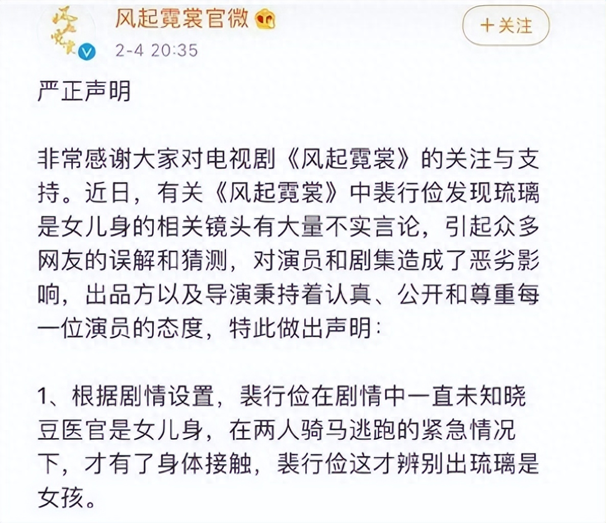 然而导演组却称是为了剧情发展,有身体接触男主才能辨别出女主是女儿身。