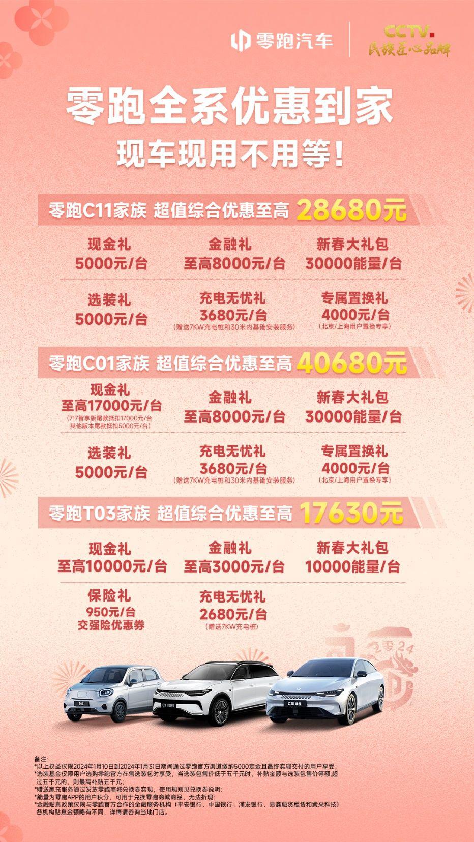 其中零跑 C01 717 智享版车型至高综合权益 40,680 元包括① 717 智享版现金优惠 17,000 元,其他版型现金优惠 5,000 元 ②全系金融贴息至高 8,000 元 ③全系选装基金至高 5,000 元 ④全系送价值 3,680 元充电桩及安装服务 ⑤全系 4,000 元置换补贴(限上海、北京)⑥全系至高 30000 商城能量积分 (可在零跑 APP 商城兑换价值 3000 元的商品,能量积分使用规则详见零跑商城【我的 - 能量 - 规则】,能量积分不可折现、不可转让)