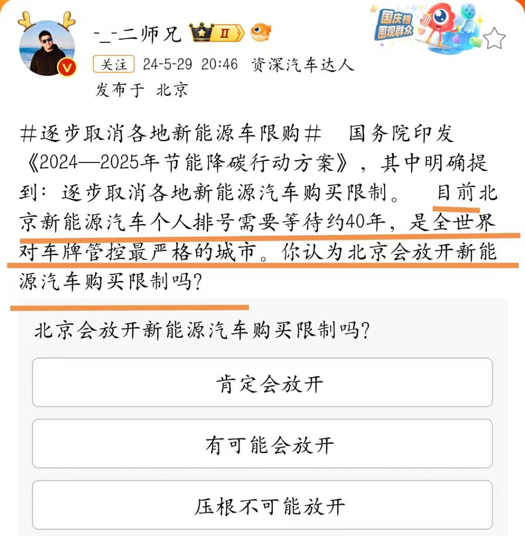 事实上,新能源汽车限购限牌的城市并不多,主要以几个一线大城市为主。以严格限购著称的北京为例,有自媒体发文表示,目前北京新能源汽车个人排号需要等待约 40 年。