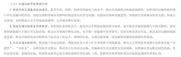 《方案》提出,加快淘汰老旧机动车,提高营运车辆能耗限值准入标准。逐步取消各地新能源汽车购买限制。落实便利新能源汽车通行等支持政策。推动公共领域车辆电动化,有序推广新能源中重型货车,发展零排放货运车队。推进老旧运输船舶报废更新,推动开展沿海内河船舶电气化改造工程试点。到 2025 年底,交通运输领域二氧化碳排放强度较 2025 年降低 5%。