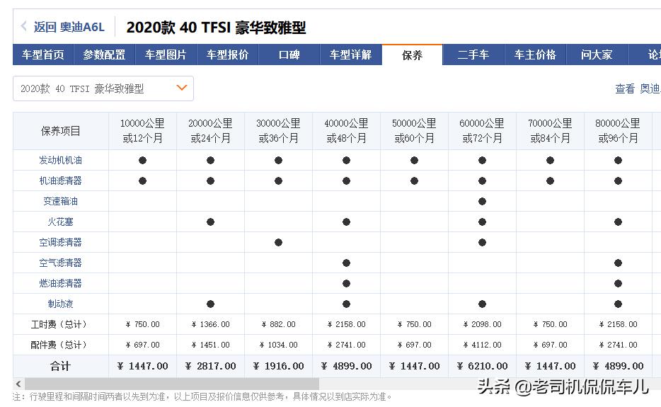 奥迪A6L小保养的价格是1447元,6万公里的保养成本是18736元,是三款车之中最高的,主要是工时费太高。好不容易省下来的油钱,又搭进去了。