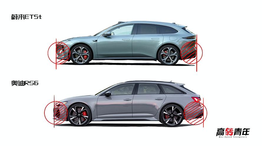 RS6 和 ET5T,比例共性还挺多。比如,都有着修长的车窗,轮轴比都是 3:1,轮高比都是 2:1,前舱比例长度基本一致。而前后悬长度方面,短前悬,长后悬的设计,让 RS6 看上去要更加的有方向感。那么,第二个问题就暴露出来了,蔚来 ET5T, 1:1 的前后悬长度,让它相对来说缺乏动感。蔚来 ET5T,需要让屁股翘一点。