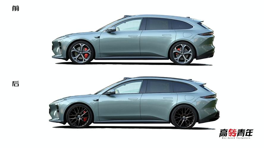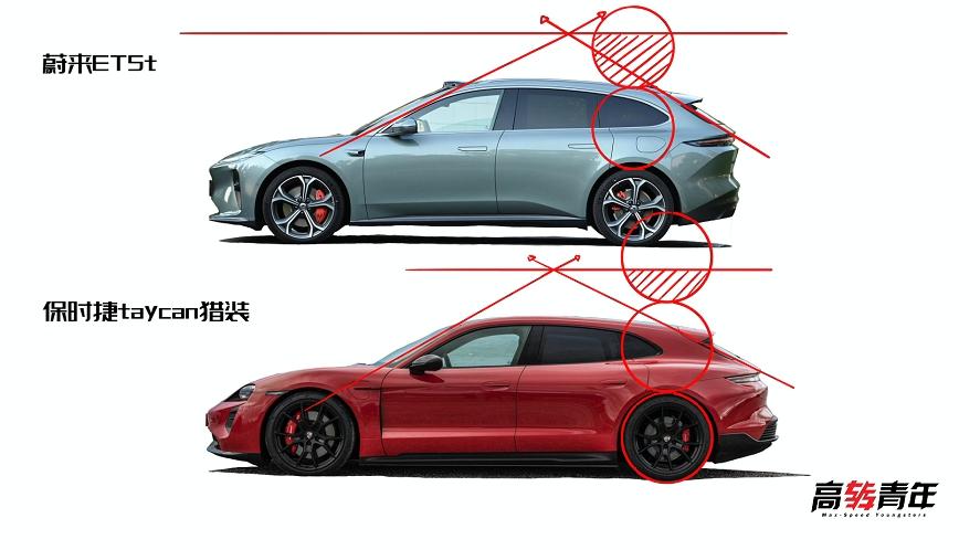 首先对比 Taycan 猎装,我们就能发现,Taycan 猎装的视觉重心要更加低。不过这也能理解,Taycan 猎装是中大型车;ET5T 是中型车,和美商、性能永远在线的跨级保时捷对比,确实是有点为难 ET5T 了。不过呢,比例的对比,也能很明显就能发现问题,那时就是 ET5T 相对来说,第一个设计问题,视觉重心偏高。