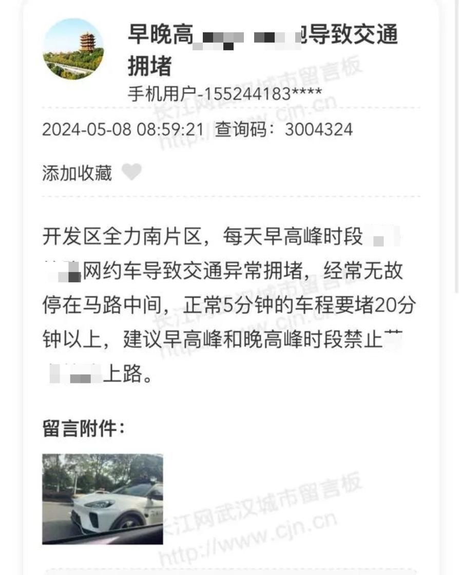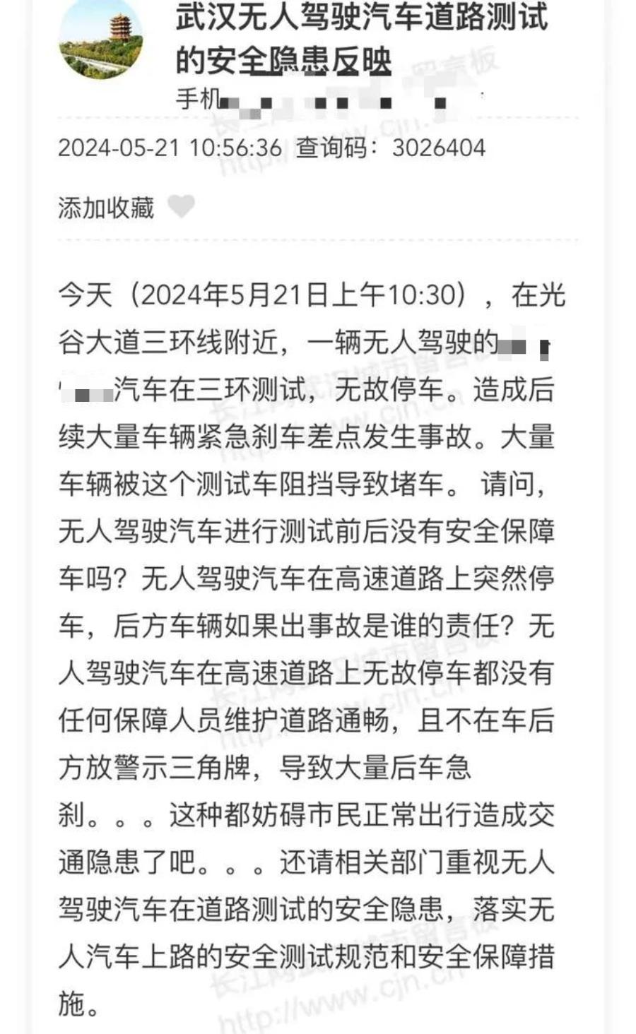 不少武汉市民反映,无人驾驶出租车经常出现绿灯时停着不走、红灯停路中间、转弯不动的情况,碰上早晚高峰时段导致拥堵。短短 5 分钟的路被堵 20 分钟,一些单车道的道路极易被堵塞,一辆无人驾驶出租车造成路上几百人走不了。