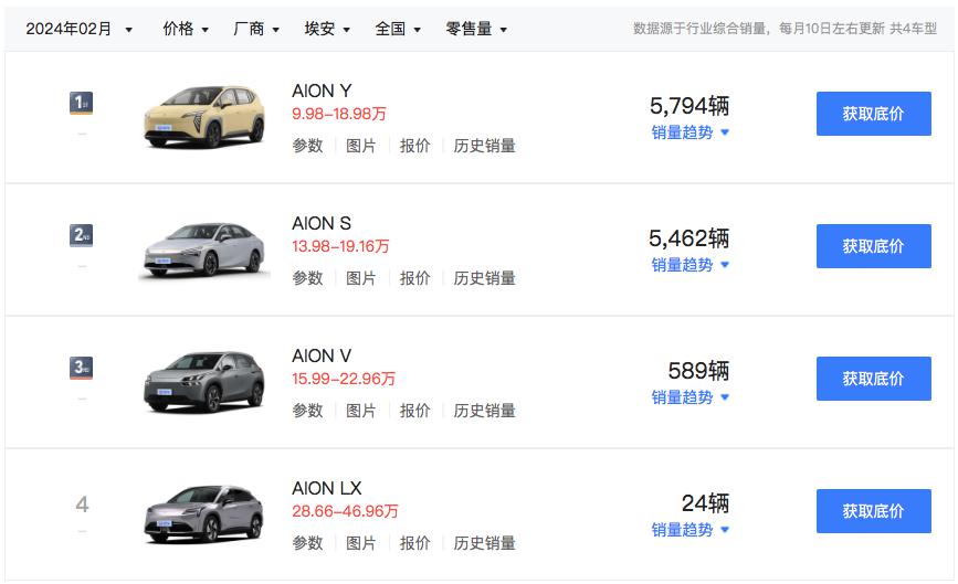 目前广汽埃安主要销量来自于 AION S 和 AION Y,2 月 AION S 零售销量为 5794 辆,这也是广汽埃安投放到网约车市场的主要车型,其次是 AION Y,为 5462 辆。为提振销量,广汽埃安发布了昊铂品牌,希望以此进入全新的市场,但该品牌暂未能成为新增长点。