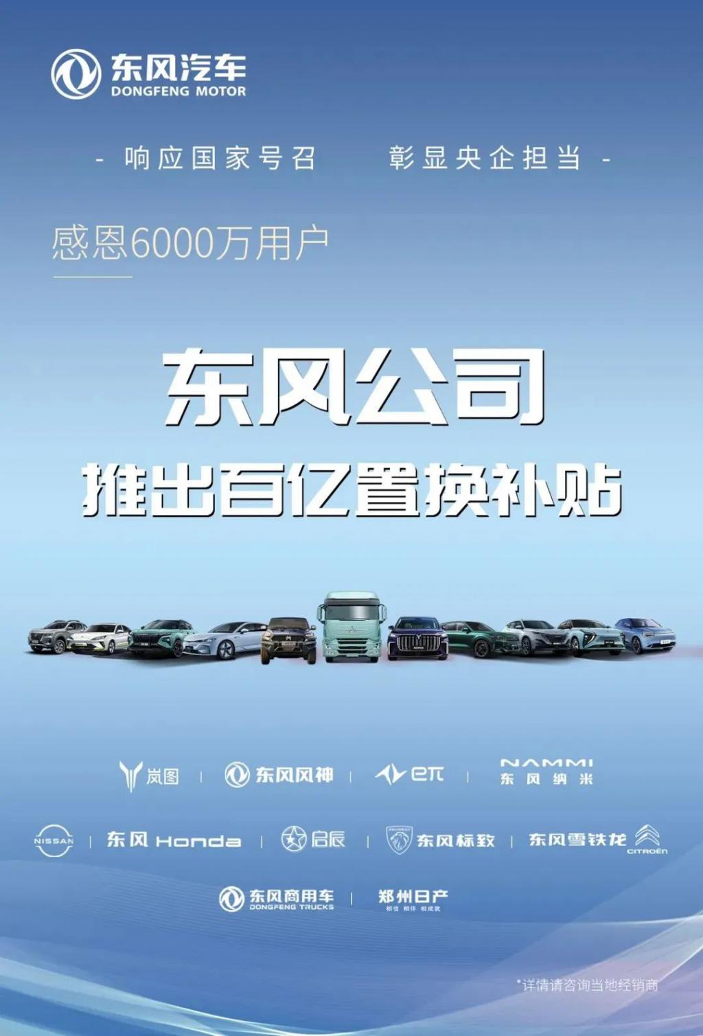 3 月 9 日,东风汽车旗下品牌车型启动汽车以旧换新行动,涵盖自主品牌、合资品牌以及商用车旗下的超 50 种车型,回馈近六千万用户,预计置换补贴超百亿。