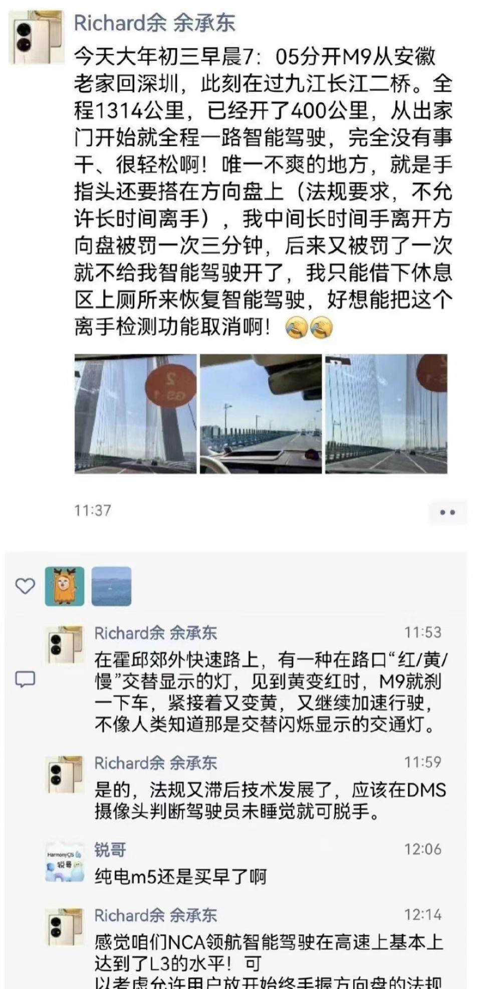 仔细分析,余承东所发的朋友圈含意很丰富,除了强调 M9 全程智驾带来的轻松感外,他还抱怨由于手长时间离开方向盘被罚两次,评论区还补充一点 " 法规滞后技术发展 "。