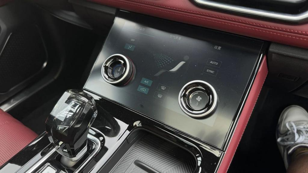 此外,一台十万元级家用 SUV 也实现了三屏操控效果。水晶挡把的前方安置了一块空调调节面板,颇有吸纳路虎家族设计灵感的效果。