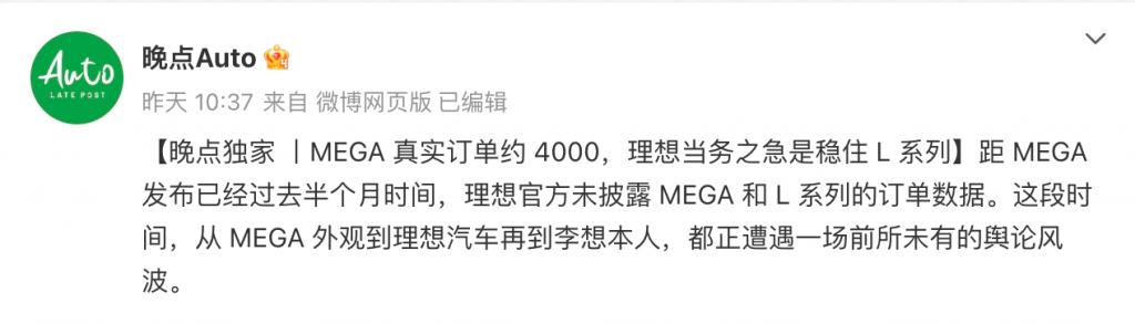 理想汽车走出与市场完全不同的趋势,或原于昨日的一则消息。消息面上,理想汽车全新车型—— MEGA 自上市以来备受争议,而距离 MEGA 上市已经过去半个月的时间,理想汽车一直未发布 MEGA 的大定数据。昨日,据《晚点 Auto》报道,MEGA 发布 24 小时内的预期订单是 3000 台左右,但最终结果未达预期,仅实现目标的一半。MEGA 发布半个月内收到近 4000 台的订单,本月工厂 MEGA 的产能为 5000 台。