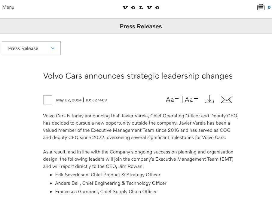 5 月 2 日,沃尔沃汽车在官网宣布一项高管变动消息。沃尔沃汽车首席运营官兼副首席执行官哈维尔 · 巴雷拉(Javier Varela)将离职。此外,首席产品与战略官 Erik Severinson、首席工程与技术官 Anders Bell、首席供应链官 Francesca Gamboni 共三位高管将进入管理团队,并直接向沃尔沃汽车 CEO 骆文襟(Jim Rowan)汇报。