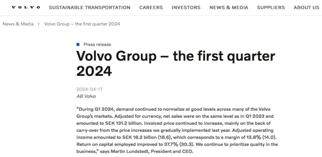 财务数据显示,今年一季度,沃尔沃净销售额为 1312 亿瑞典克朗(约 867.98 亿人民币),与去年同期基本持平,但超市场预估的 1291.8 亿瑞典克朗;调整后营业利润为 181.6 亿瑞典克朗(约 120.15 亿元人民币),超预估的 172.4 亿瑞典克朗;调整后营业利润率为 13.8%。