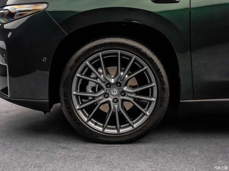 实拍车型的 20 英寸枪灰色轮圈造型运动,与之匹配的是邓禄普 e.SPORT MAXX 系列轮胎,这是为新能源车型打造的低滚阻同时兼顾湿地操控和降噪的产品,规格为 245/45 R20。