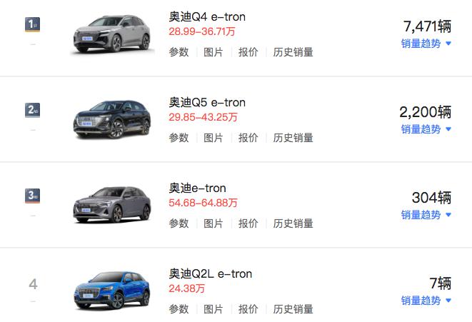 中国是奥迪全球最大的单一市场,其在华已布局一汽 - 大众、上汽奥迪和奥迪一汽三家合资公司,但在华市场的表现不佳。官网显示,目前奥迪在中国销售的新能源汽车包括 Q2L e-tron、A6L e-tron、Q4 e-tron、e-tron、Q5L e-tron 等,但销量表现并不出色。零售数据显示,今年上半年,销量最高的车型为 Q4 e-tron,销量为 7471 辆,Q5 e-tron 为 2200 辆,e-tron 为 304 辆,Q2L e-tron 仅 7 辆。