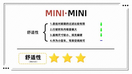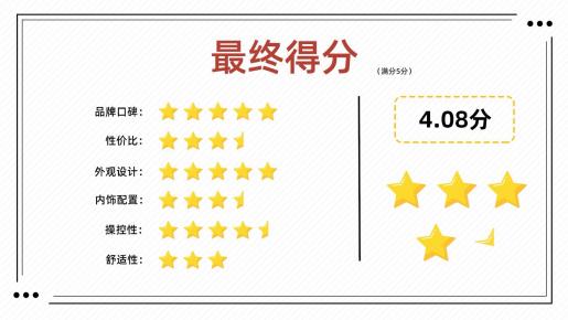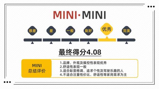 综合以上各项评分的平均分,MINI的最终得分为4.08分,其品牌、外观及操控性表现优秀,但舒适性表现一般。