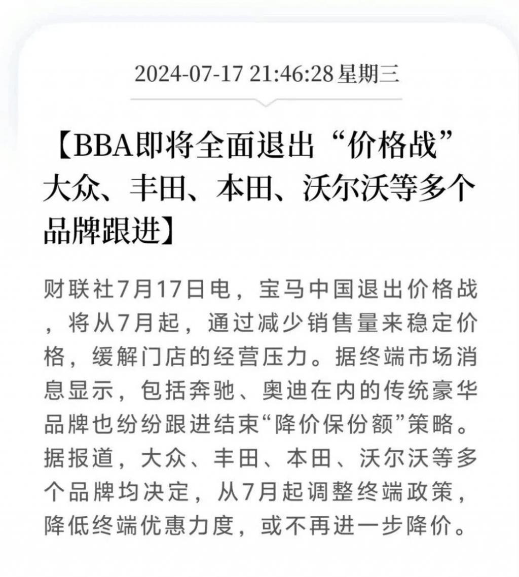 就在宝马传出退出价格战之后,财联社报道称,包括奔驰、奥迪、广本、大众、沃尔沃等合资品牌,也宣布集体退出价格战。