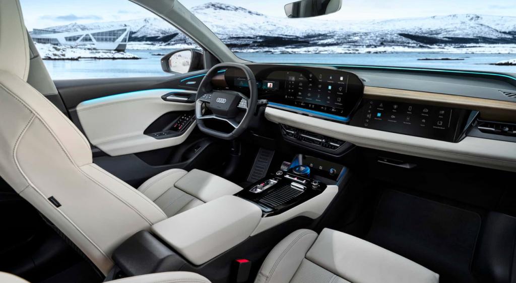 内饰,这次奥迪 Q6 e-tron 也有四块屏了,除了 11.9 英寸的仪表屏和 14.5 英寸多媒体曲面屏,还能选装 AR-HUD 和 10.9 英寸的副驾驶屏幕。