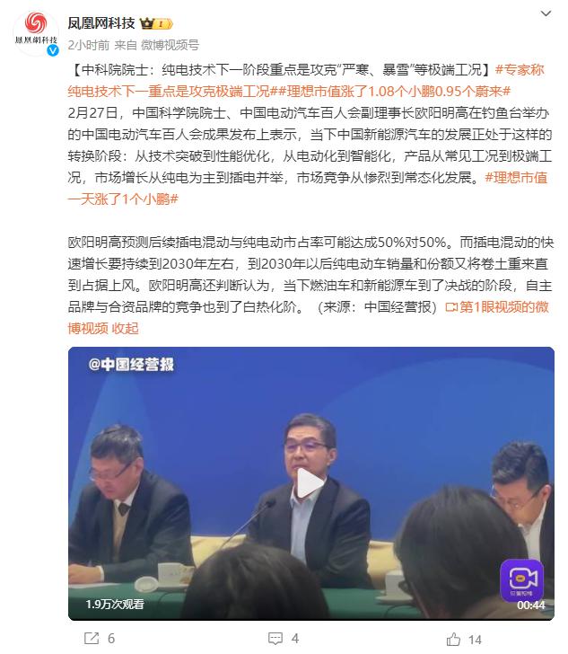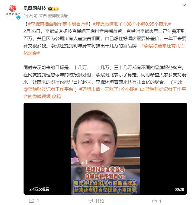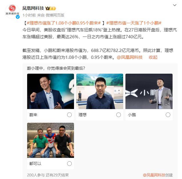 甚至凤凰网科技今天发的三条微博,都带上了三家对比的词条,# 理想市值涨了 1.08 个小鹏 0.95 个蔚来 ## 理想市值一天涨了 1 个小鹏 #