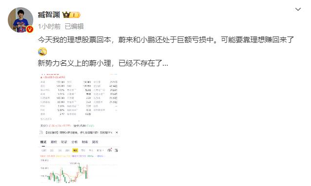 譬如,很多支持理想的博主已经不说「蔚小理」了,而是说「理蔚鹏」。而在今天,博主 @ 臧智渊表示,「新势力名义上的蔚小理,已经不存在了……」