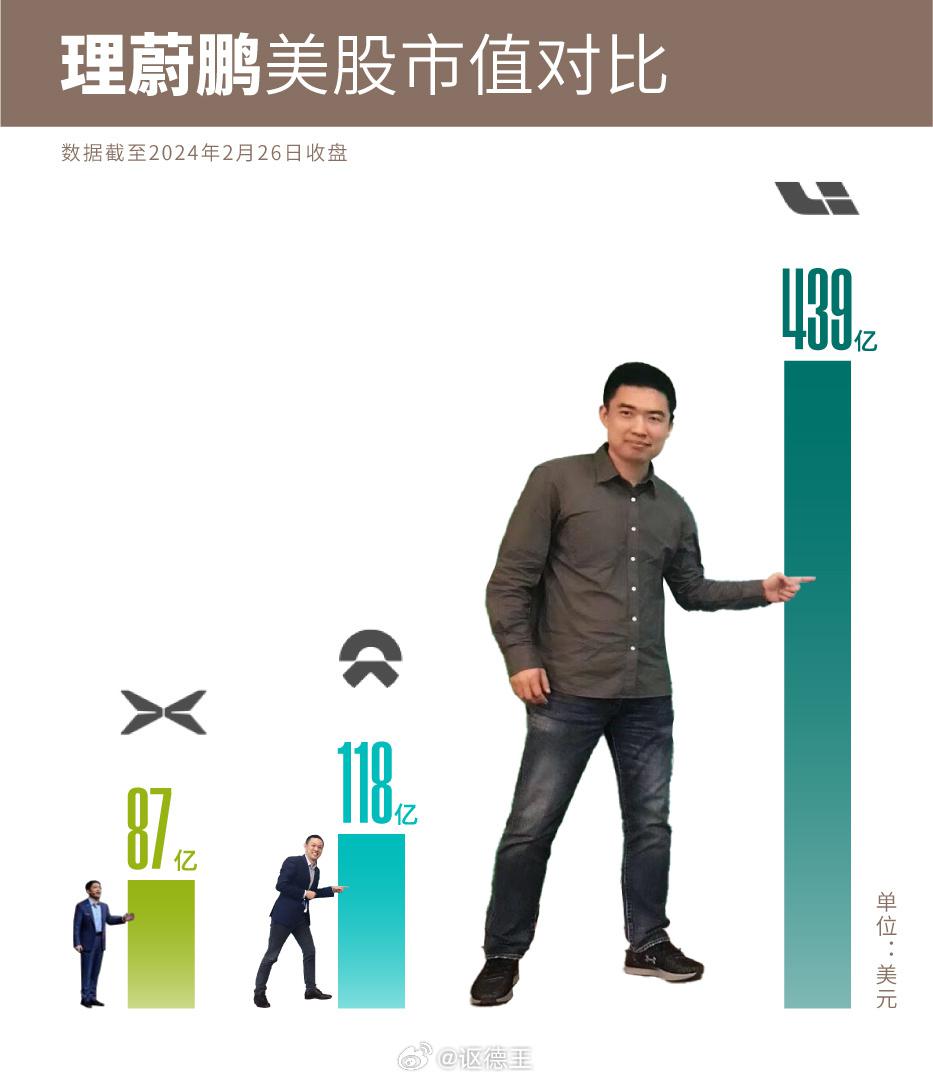博主 @ 讴德王 则制作了一张全新的「理蔚鹏美股市值对比」图,各家 CEO 站在代表市值的竖条旁,将差距演绎得更加直观。