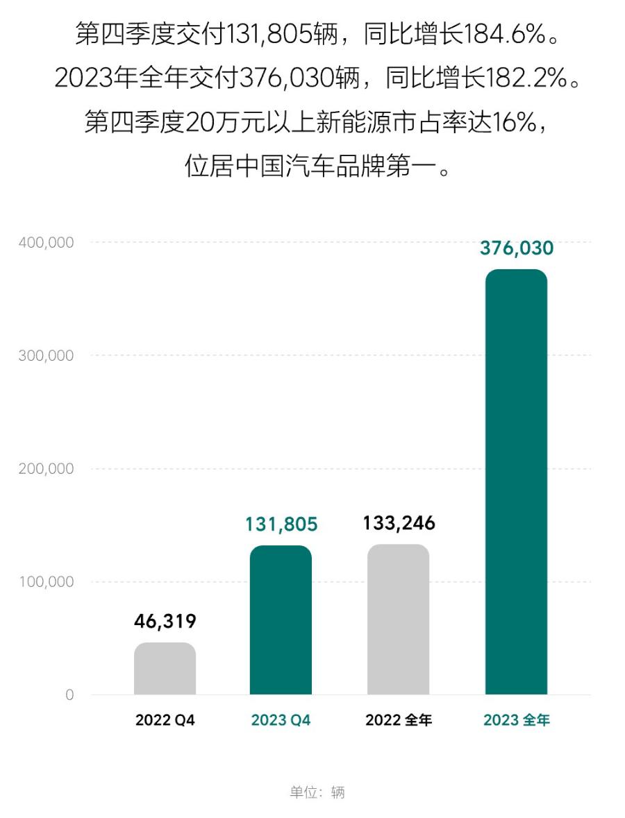 具体来看,第四季度理想营收 417.3 亿元,同比增长 136.4%;季度交付量 131,805 辆,同比增长 184.6%;全年实现营收 1238.5 亿元,同比增长 173.5%;全年交付量 376,030 辆,同比增长 182.2%。