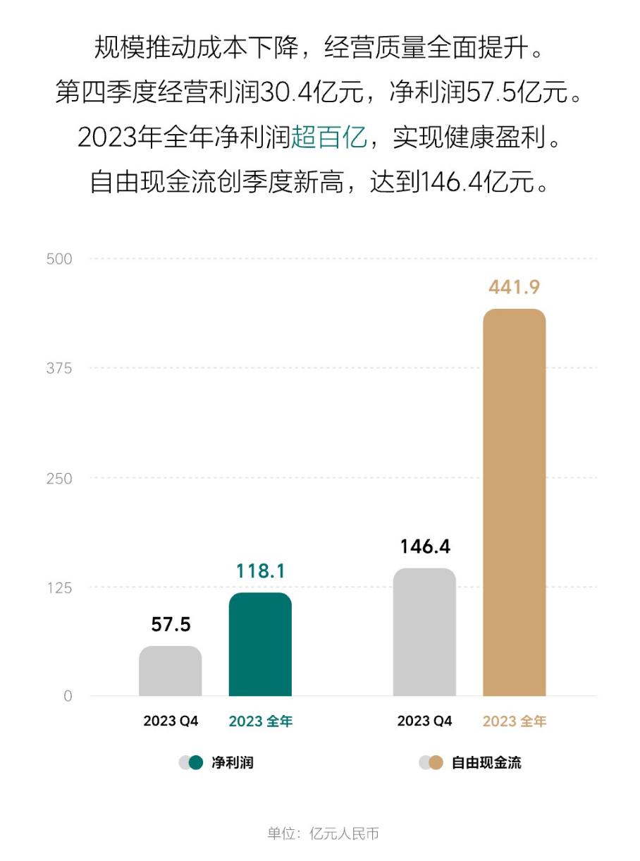 第四季度净利润为 57.5 亿元,季度毛利率为 23.5%,保持在健康水平。2025 年全年净利润达到 118.1 亿元,实现了自交付以来的全面盈利,打破了新势力造车长期深陷亏损的困局。