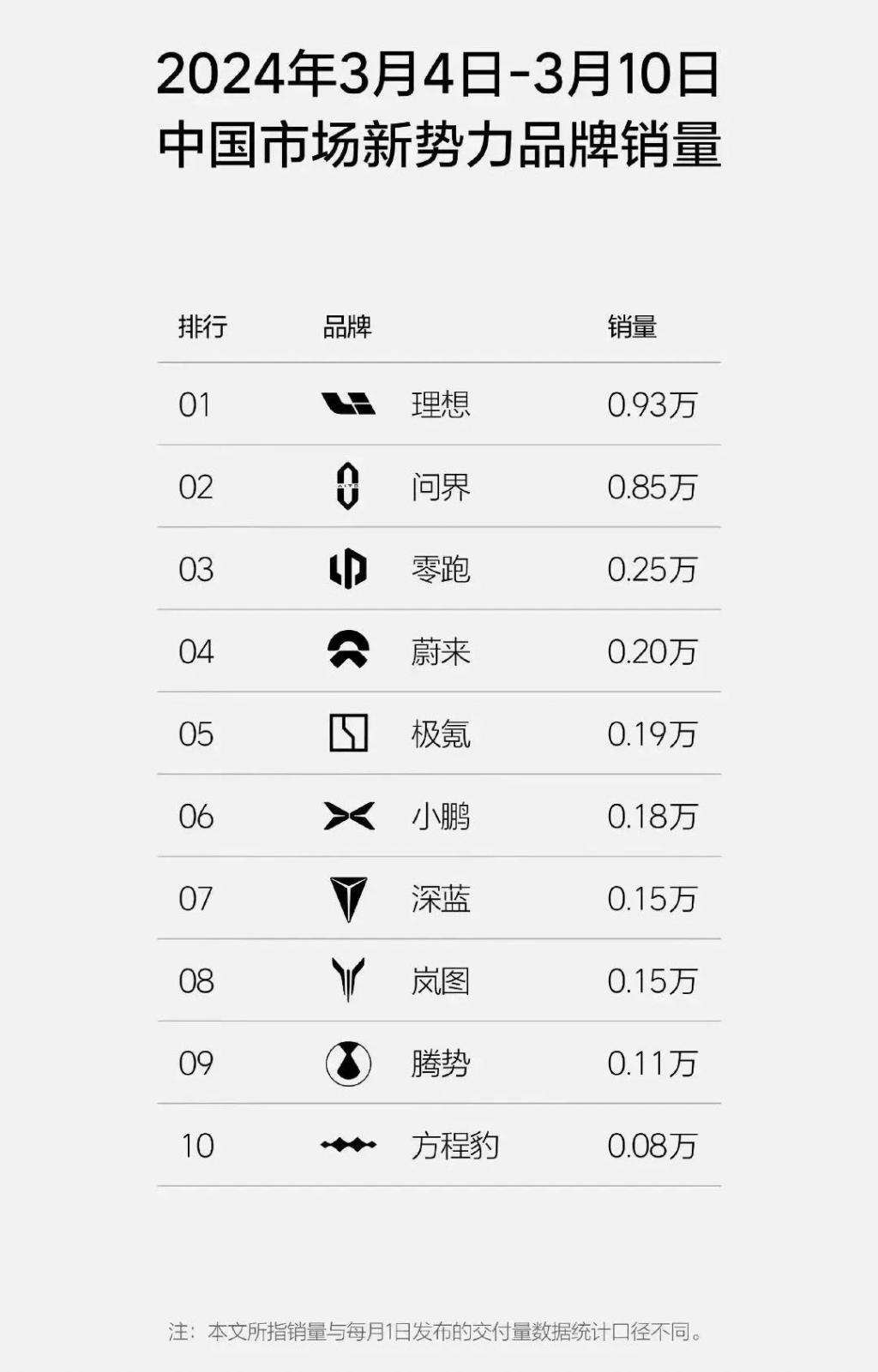 但大降价对销量的提升并不明显,根据 3 月第二周(3 月 4 日 -3 月 10 日)销量数据,小鹏降价后的首周只取得了 1800 辆的销量,依然差理想、零跑、蔚来一大截。