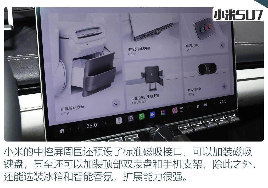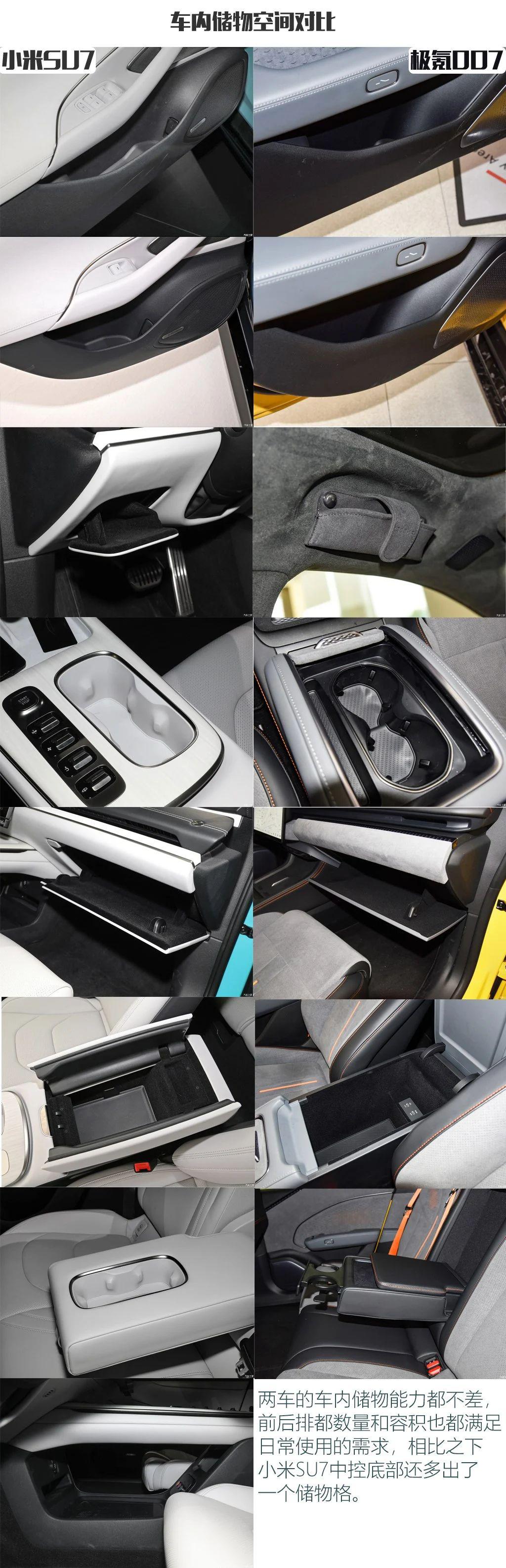 空间方面,两车车内都有足够的储物格满足日常需求,并且也都配有前后备厢用来储物,只不过小米 SU7的容积更大。