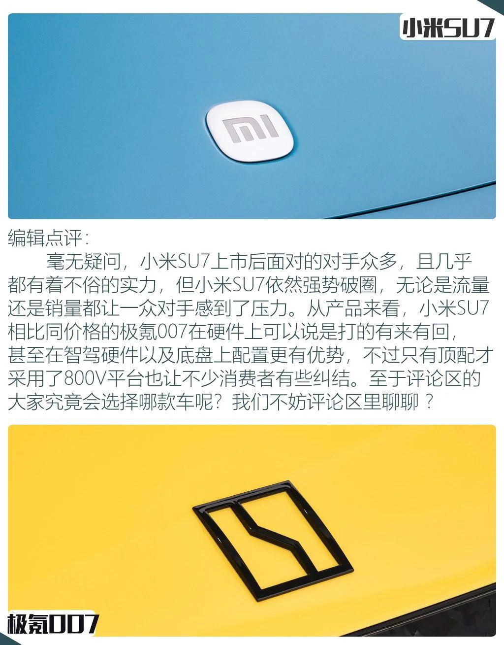 此次面对极氪 007 的顶配版本,小米 SU7 的静态表现也非常不俗,甚至有些配置表现更优,但单从一个配置的表现还无法代表整体车型的表现,且只有顶配才采用 800V 平台也让不少消费者在选购时产生犹豫,并且 SU7 上市后,极氪 007 马上推出了新配置拉低了整体售价,看来,真正的好戏似乎才刚刚开始?
