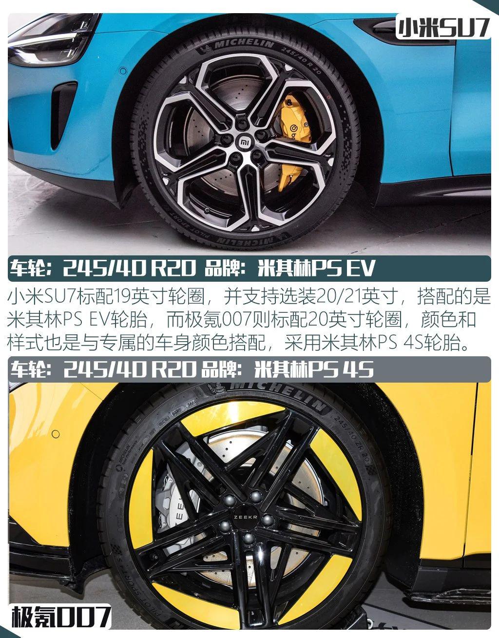 轮胎方面,小米标配 19 英寸轮圈,并支持选装 20 或 21 英寸版本,顶车型刹车采用的是 Brembo 四活塞卡钳+打孔通风盘。而极氪 007 则使用的是 20 英寸轮圈,并且搭配性能更强的米其林 PS 4S 轮胎,制动系统则是来自 Akebono 的四活塞卡钳 + 打孔通风盘。