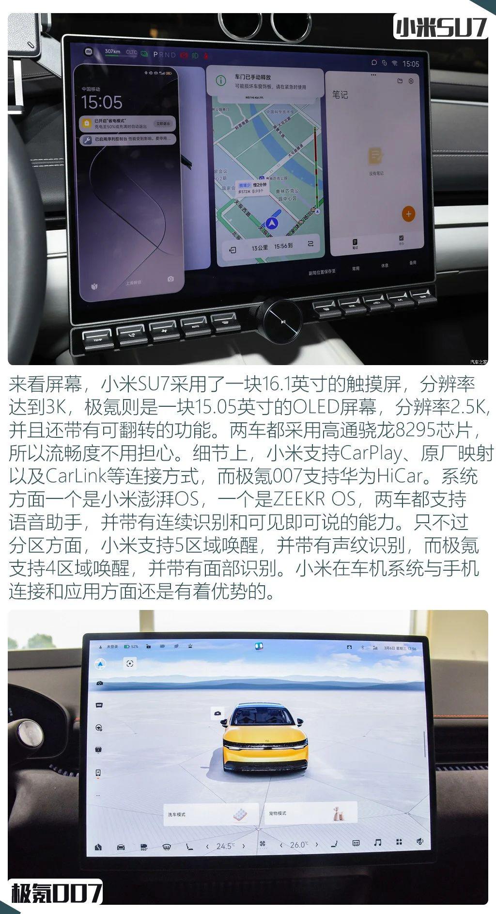 整个硬件表现可以说互有优势,比如小米的仪表盘尺寸小,但 HUD 尺寸大,而极氪仪表尺寸大,但 AR-HUD 的尺寸小了些,屏幕方面也是,小米采用了尺寸更大的屏幕分辨率也更高,但极氪 007 的屏幕采用的是 OLED 屏幕,还带有转向功能。
