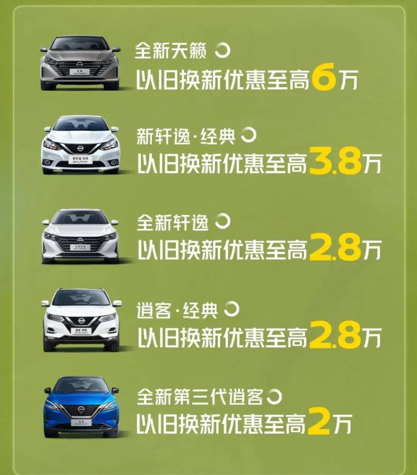 比如上汽大众朗逸新锐出众版限时售 7.999-8.799 万元,购置税全免;东风日产推出 " 超级置换季 " 活动,全车系以旧换新优惠至高 6 万元;一汽 - 大众全系限时追加现金补贴至高 5000 元、追加置换补贴至高 4000 元、享置换补贴至高 2.4 万元;探岳家族、迈腾至高享商业险免单。