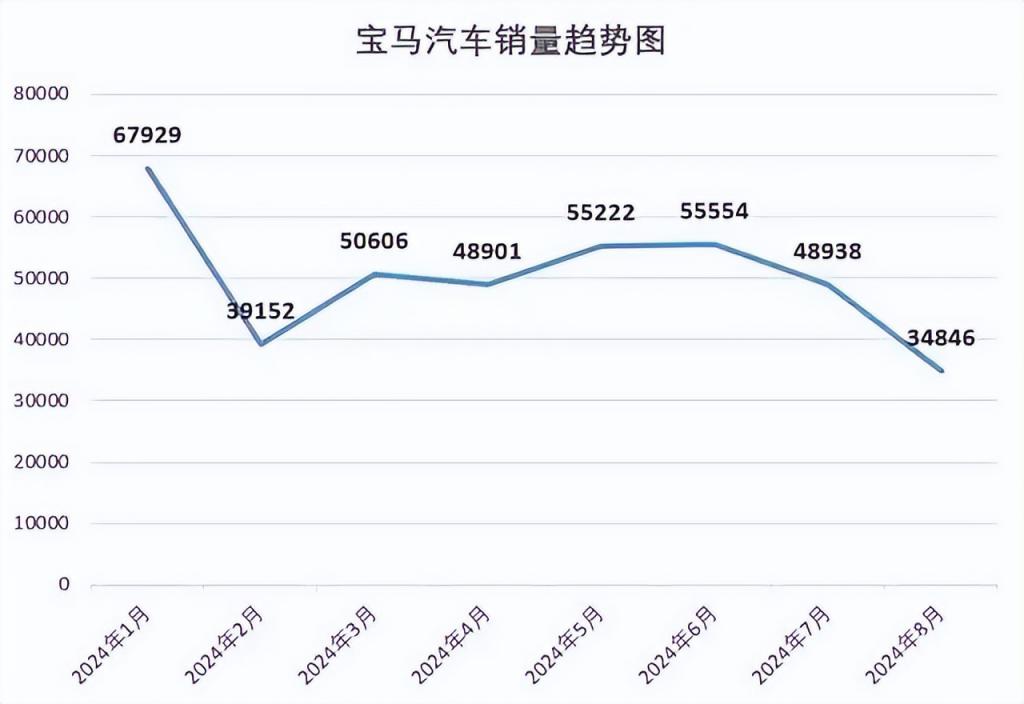 8 月,宝马中国总销量为 3.48 万辆,较去年同期的 6 万辆来看,销量接近于腰斩。作为参考,奔驰销量为 4.9 万辆,奥迪为 4.79 万辆,分别同比下滑了 13.83% 和 16.0%。也就是说传统 BBA 三大巨头,虽然各自销量都有所下滑,但下滑最严重的还是宝马。