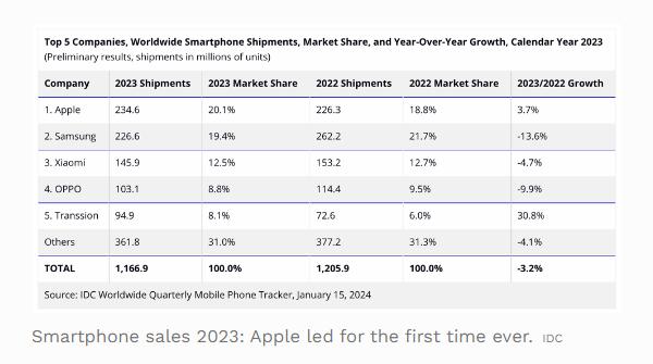 2023 年智能手机销量:苹果首次领跑。图片来源:IDC