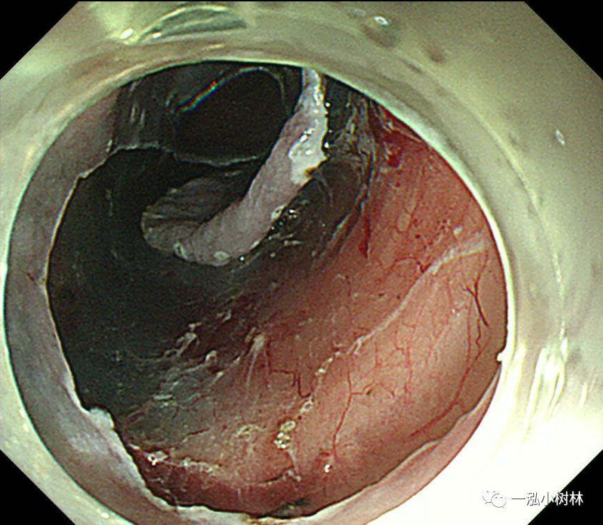 图8 行左侧黏膜下剥离术。在重力的作用下,黏膜剥离(左侧卧位行ESD)