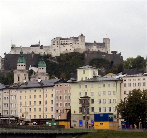 霍亨-萨尔茨堡(Hohensalzburg Castle)始建于1077年,历经了九百多年的风风雨雨,依然巍峨挺拔地矗立在一百多米高的丘陵上,它是中欧地区规模最大的一座古城堡了,也是历代萨尔茨堡市主教的居住地。城堡内有街道,四周的城墙又高又厚。