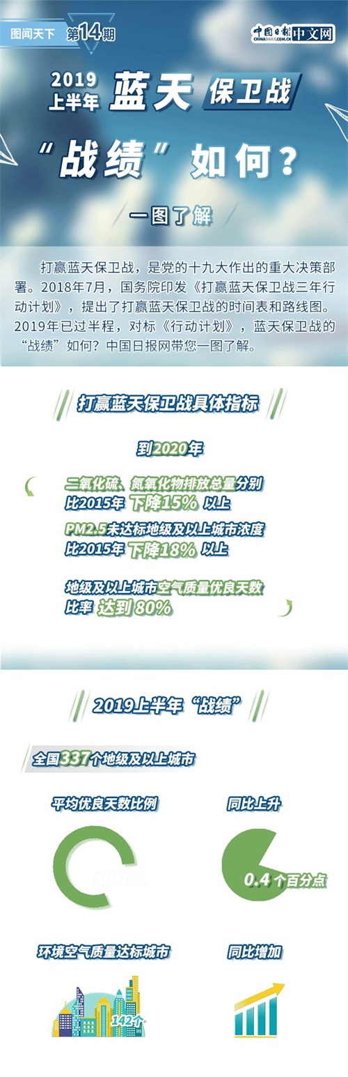 编者按:打赢蓝天保卫战,是党的十九大作出的重大决策部署。2018年7月,国务院印发《打赢蓝天保卫战三年行动计划》,提出了打赢蓝天保卫战的时间表和路线图。2019年已过半程,对标《行动计划》,蓝天保卫战的“战绩”如何?中国日报网带您一图了解。