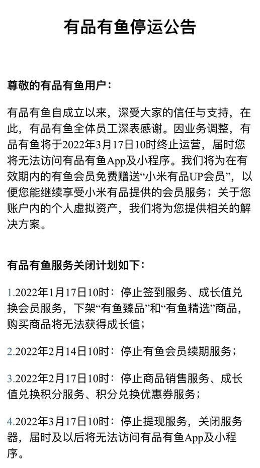 1月17日消息,小米旗下新国货会员制电商平台有品有鱼宣布将于2022年3月17日终止运营。
