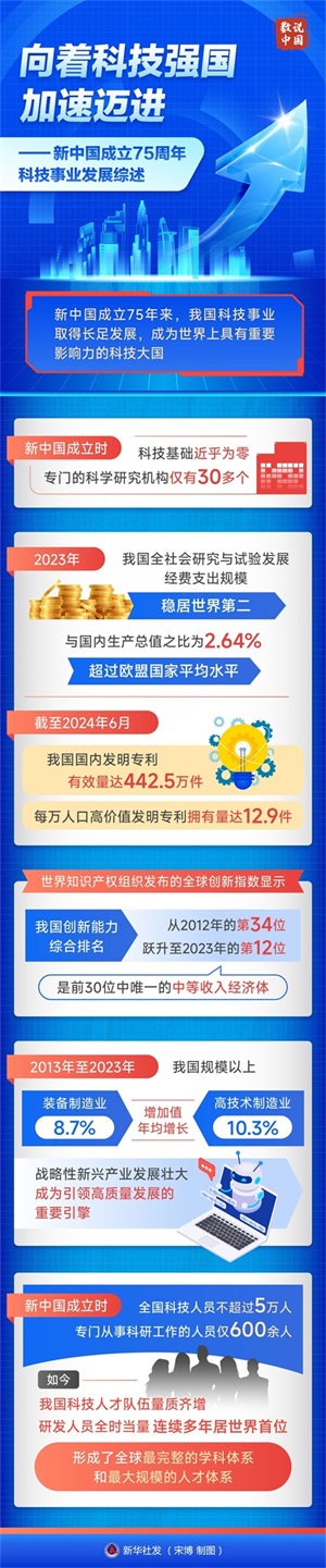 新中国成立75年来,我国科技事业取得长足发展,成为世界上具有重要影响力的科技大国。