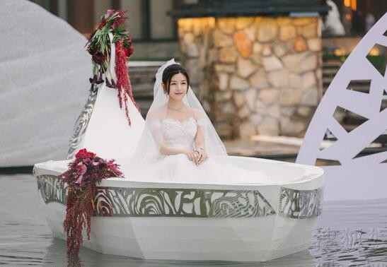 陈妍希乘坐白色小船美艳动人。