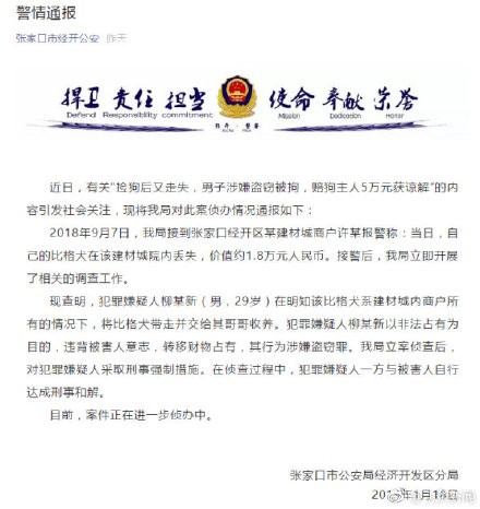 【男子称因捡狗被拘 警方回应:涉嫌盗窃,双方已和解】捡狗涉嫌盗窃被拘近日,有关“捡狗后又走失,男子涉嫌盗窃被拘,赔狗主人5万元获谅解”的内容引发社会关注,“张家口市经开公安”发布通报称:张家口经开区某建材城商户许某报警说自己的比格犬在该建材城院内丢失,价值约1.8万元人民币。现查明,犯罪嫌疑人柳某新(男,29岁)在明知该比格犬系建材城内商户所有的情况下,将比格犬带走并交给其哥哥收养。犯罪嫌疑人柳某新以非法占有为目的,违背被害人意志,转移财物占有,其行为涉嫌盗窃罪。目前,犯罪嫌疑人一方与被害人自行达成刑事和解。案件正在进一步侦办中。