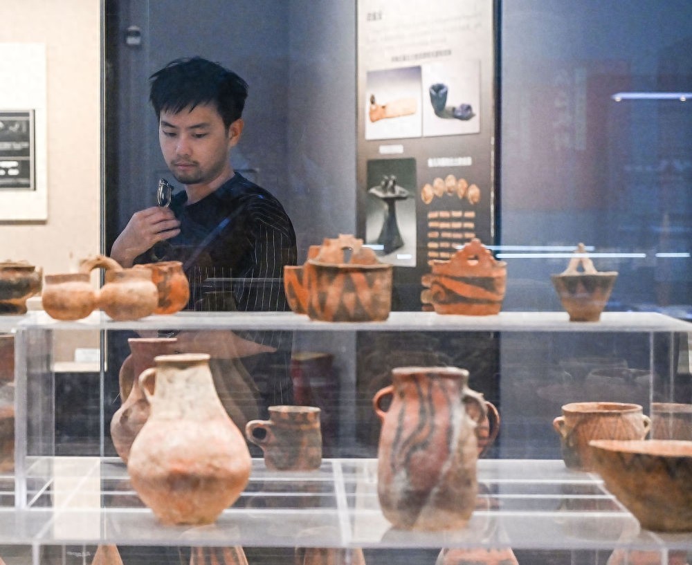 ↑5月14日,游客在吐鲁番博物馆通史展厅观看彩陶罐。
