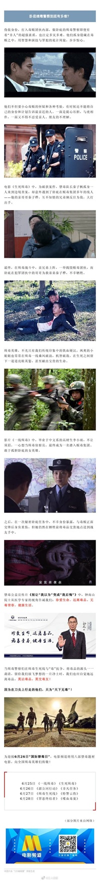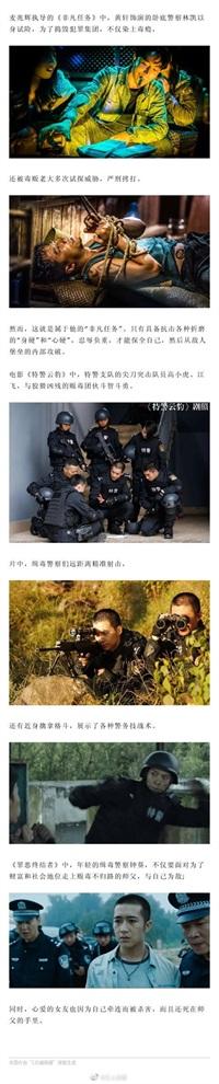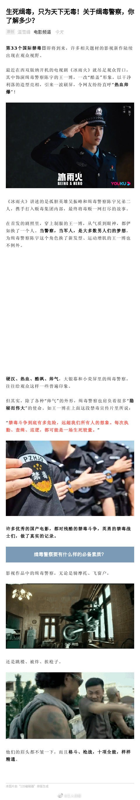【生死缉毒,只为天下无毒!关于缉毒警察,你了解多少?】中国现有吸毒人员214.8万名今天是国际禁毒日,许多相关题材的影视新作陆续出现在观众视野。最近在西双版纳开机的电视剧《冰雨火》中饰演缉毒警察陈宇的 @UNIQ-王一博,引来一波刷屏。在《非凡任务》《特警云豹》《罪恶终结者》《缉毒生死线》《湄公河行动》《生死缉毒》《一线缉毒》等影视作品中感受中国缉毒警察的魅力吧!