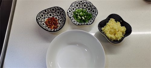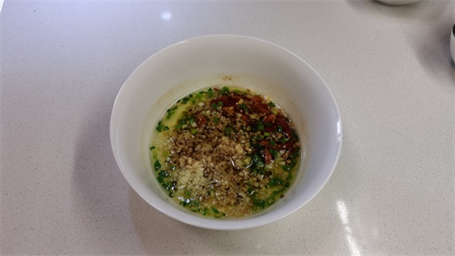 3、调一碗秘制料汁,干辣椒、蒜蓉、葱末、1勺白糖、半勺蚝油、1勺香醋、1勺辣椒油
