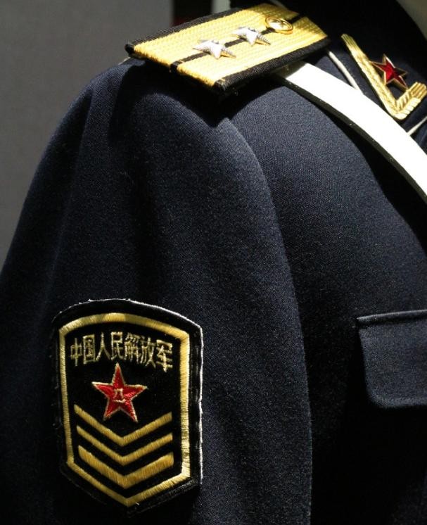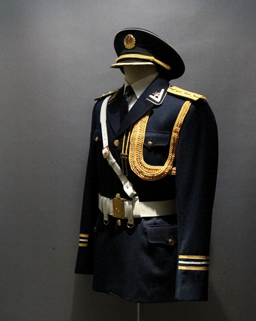 解放军92式海军仪仗队军官冬礼服。采用藏青色礼服呢面料,最后一代解放军的全蓝制服(帽子、衣服、裤子均为藏青色)。