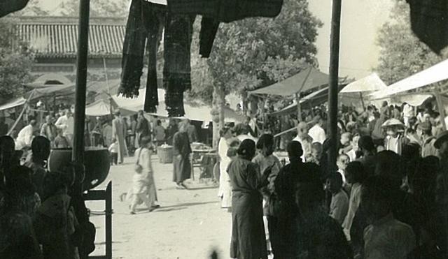 每年农历四月十八,是碧霞元君的生日,娘娘庙总会举办庙会,各种仪式不断,更有耍把式卖艺的、销售小商品的、唱大戏的聚集在此,是老北京春天最热闹的民间物资交流的场所。图片中,是1938年5月份,北顶娘娘庙赶庙会。