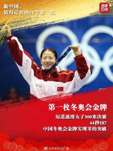 新中国,值得记住的70个第一次【第一枚冬奥会金牌】2002年2月16日,中国运动员杨扬在美国盐湖城举行的第十九届冬奥会短道速滑女子500米决赛中一路领先,最终以44秒187的成绩问鼎冠军,实现了中国冬奥会金牌零的突破,成为中国队自1980年首次参加冬奥会以来夺金第一人。