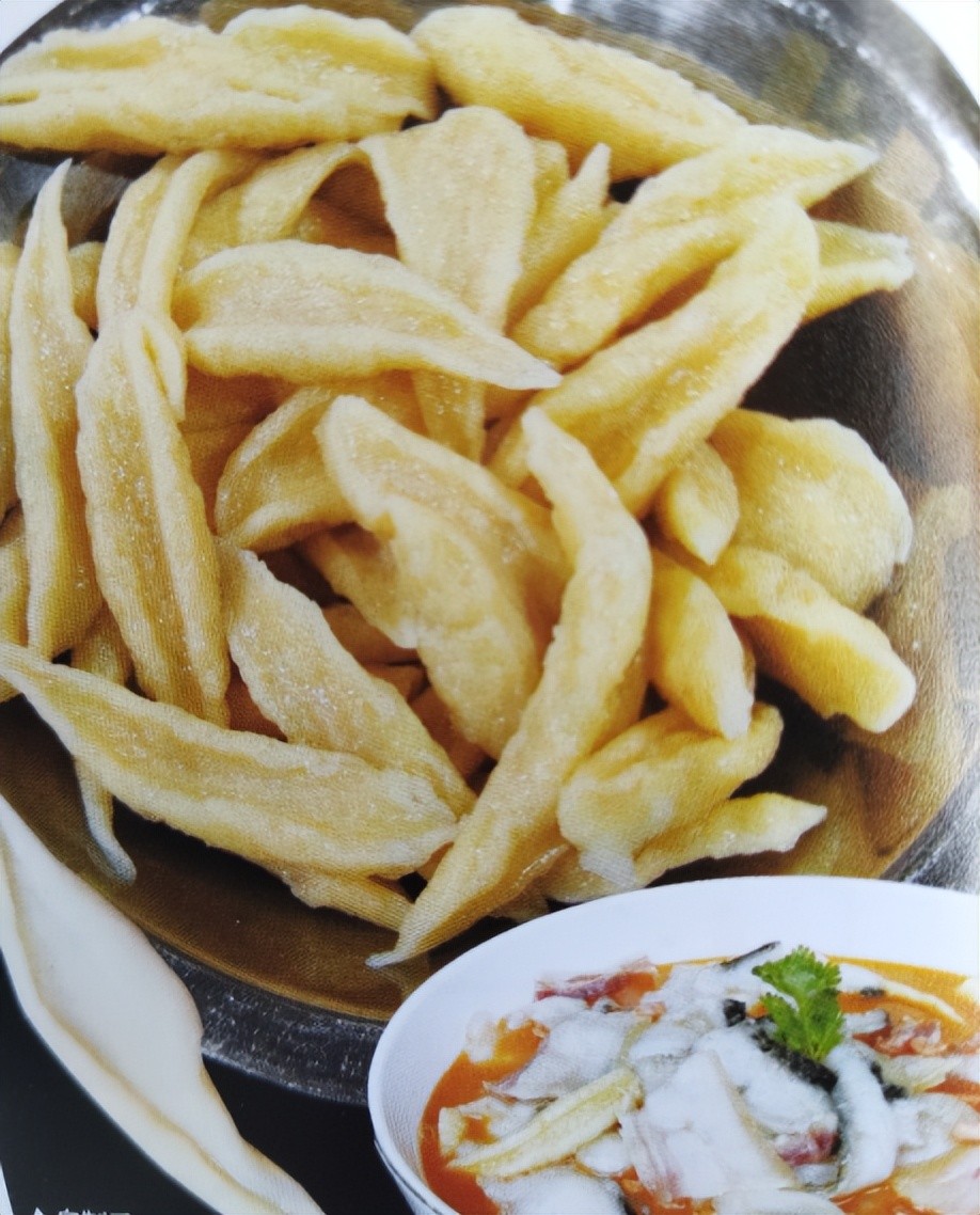 具体做法 面粉500克、生粉100克、食盐2克混合均匀,加鸡蛋液180克、清水190克,倒入搅拌机,搅打均匀后,用压面机压制均匀,饧发10分钟;锅下宽水烧开,保持大火滚沸,将和好的面团用剪刀依次修成两头尖中间粗的“小鱼”形状,下锅煮至断生、浮起,继续煮约1分钟后捞入冷水彻底投凉,控干后拌少许色拉油避免粘连,收入保鲜盒随用随取即可。我们用鲜虾汤搭配鱼片和手工面鱼,做成龙虾汤鱼片煨面鱼,口味鲜香,毛利很高。做法是:1.黑鱼片200克冲洗干净,用蛋液40克、生粉15克上浆,将鱼片焯水制熟。2.净锅倒入葱姜油60克,将虾头8个煸炒出虾脑,冲入浓汤600克,用盐1.5克、鸡精3克、白胡椒粉2.5克、鸡汁8克、家乐瑶柱汁10克调味,下入面鱼260克煨制1分钟,捞出打底,再次下入黑鱼片、咸肉片50克、海米15克,大火炖至入味,装盘即可。