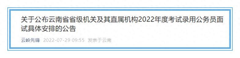 7月29日,云南省公务员局发布关于公布云南省省级机关及其直属机构2022年度考试录用公务员面试具体安排的公告,详情如下: