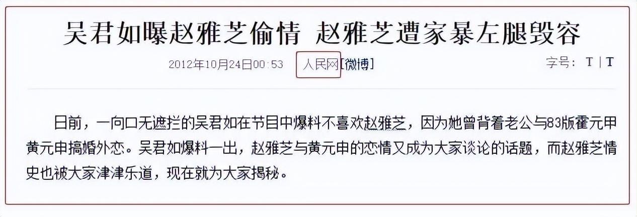 2012年2月,吴君如在访谈节目《星星同学会》中,公然说道:“我为什么不喜欢赵雅芝,因为她作为有夫之妇和黄元申有亲密关系。”