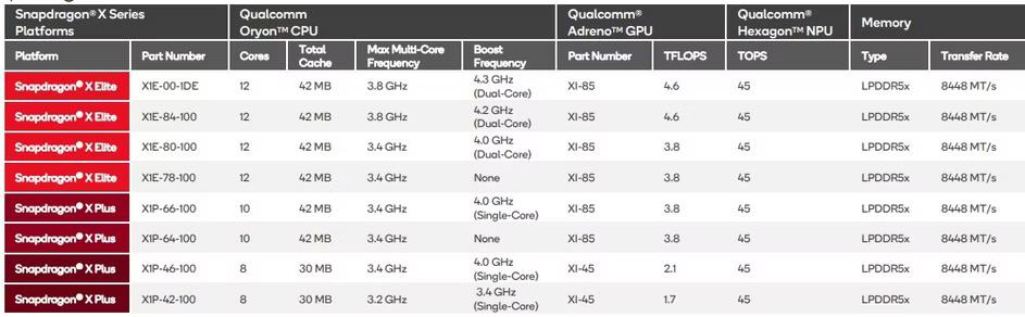 然而,骁龙 X Plus 8 核的 Adreno GPU 性能要比 10 核版弱得多(1.7 TFLOPs VS 3.8 TFLOPs)。不过 NPU 性能达到了 45 TOPS,意味着搭载新处理器的笔记本电脑都将支持 Copilot+。